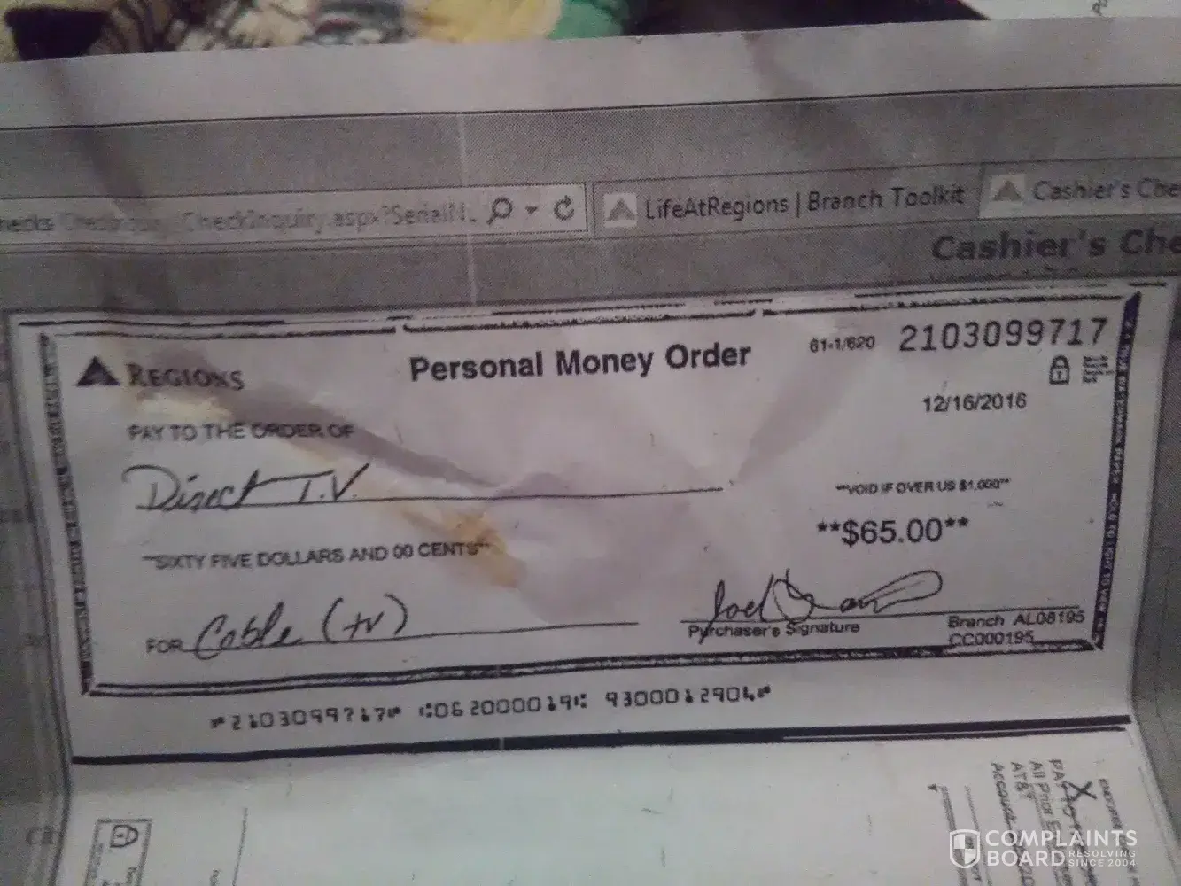 My name is Joel landreth and my acct # is12940861, I sent a 65$ money order to you on 12/16/2016 and I went to regions bank where the money order was gotten and they said it went to you but y'all said you never received it and I have proof and the money order says to direct TV and the money order number is [protected]. On where it says for, I put cable TV so I want to know where or what account you put it on cause it was not mine and now my cable is off because of this mistake because I sent it to you and y'all say y'all never got it and iv got the proof right here and I gave you all the information, the acct # and money order #, so would you please contact me and fix this problem, it's caused us to ne behind for no reason. My number is [protected], Sincerely Joel David landreth.