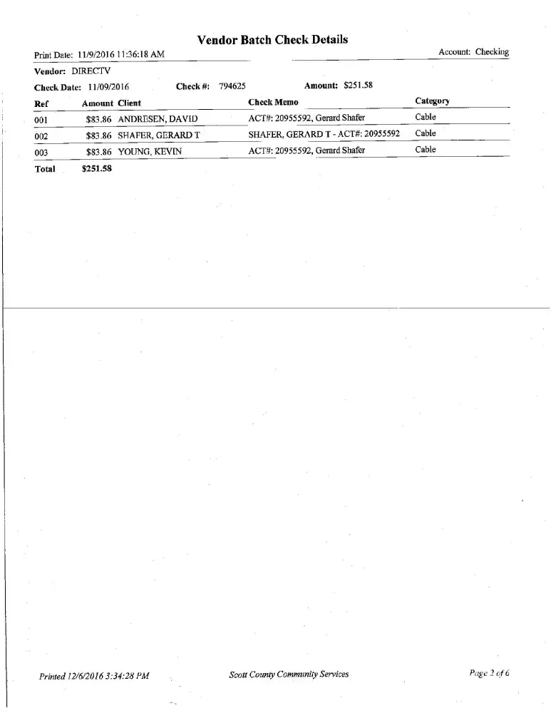 I'm writing on behalf of a Gerard Shafer. He is a disabled adult. He lives with two other disabled adults; Kevin Young and David Andresen. I am Jake Walker, Gerard's caseworker. DirectTV has stated that they have not received payments since September and have cut service. The checks are paid on Gerard's account through Scott County Community Services (Social Security), from each of the three gentlemen. I have proof that they paid as recently as November and the checks have been cashed by DirectTV. Direct TV says this has not happened. I even submitted proof of payment to the address they told me to and never heard anything back. I called them again and they directed me to you. I am submitting proof of payment. I would like the service restored and for no additional charges to be applied. I don't believe the guys should be punished financially for Direct TV's error. I would appreciate a response as quickly as possible.
