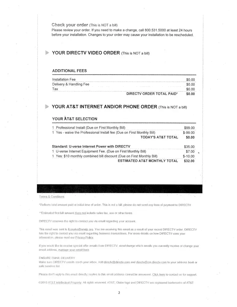 On 1/8/16 att and dtv confirmed my entire bundle order was cancelled and I would not be charged for any of it.