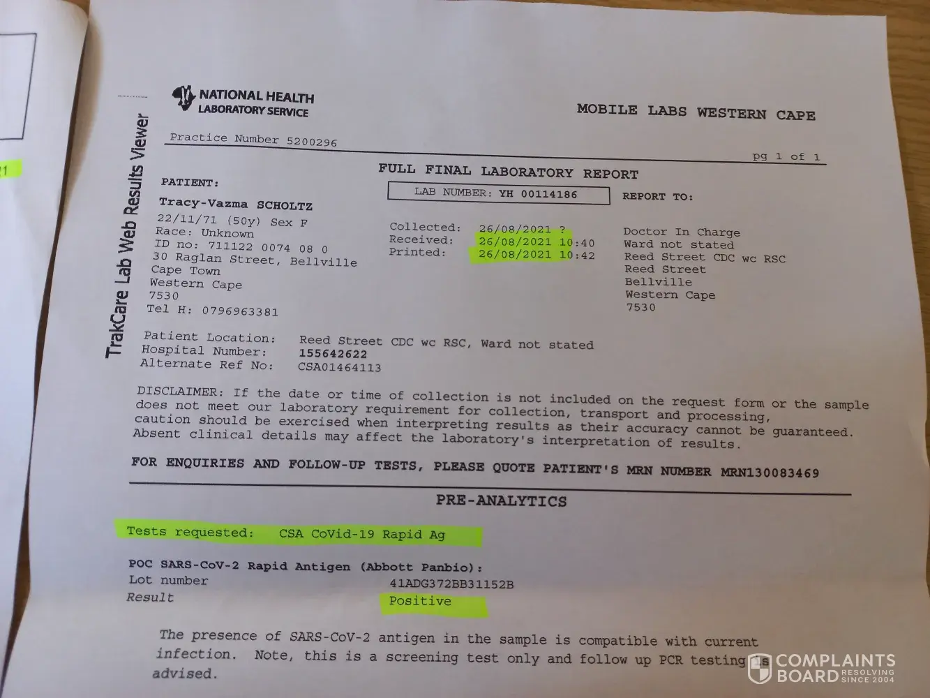 On wednesday the 25th of august I had a covid test at century city dischem. I am a monkeynastix instructor and work with more than 150 children at different locations every week. As I was not feeling well, and not wanting to endanger the children I decided to go for a covid test with money I did not have as my husband lost his job last year. I was tested and told I am negative. My husband was waiting for my result as he had to go for his second vaccination which he obviously did as apparently I was negative.