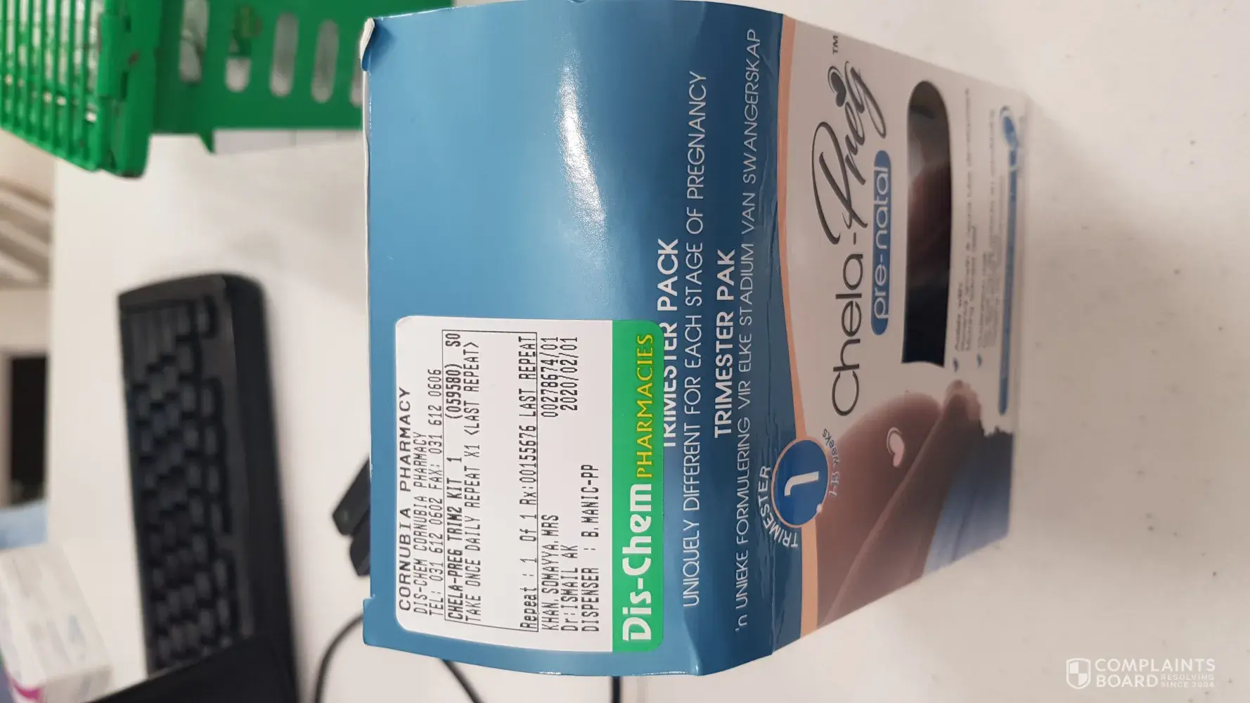 I was very ill and could not even stand by the pharmacy counter. I took the packet and headed for the tills. I came home and started the course of chela preg not noticing that she had actually given me the wrong chela preg supplement. She had actually given me chela preg for 1st trimester and billed me for chela preg 2nd trimester as per dispensary label on the box, yet I required chela preg 3rd trimester as I had advised her that I was 35 weeks pregnant. When I opened the containers the tablets for both day and night looked the same, so I did not question or double check packaging. To my surprise two days ago I took a closer look and saw that the pharmacist had actually given me the incorrect trimester for chela preg and even billed me for the wrong trimester. She gave me chela preg 1, billed me for chela preg 2 and yet I was supposed to get chela preg 3.