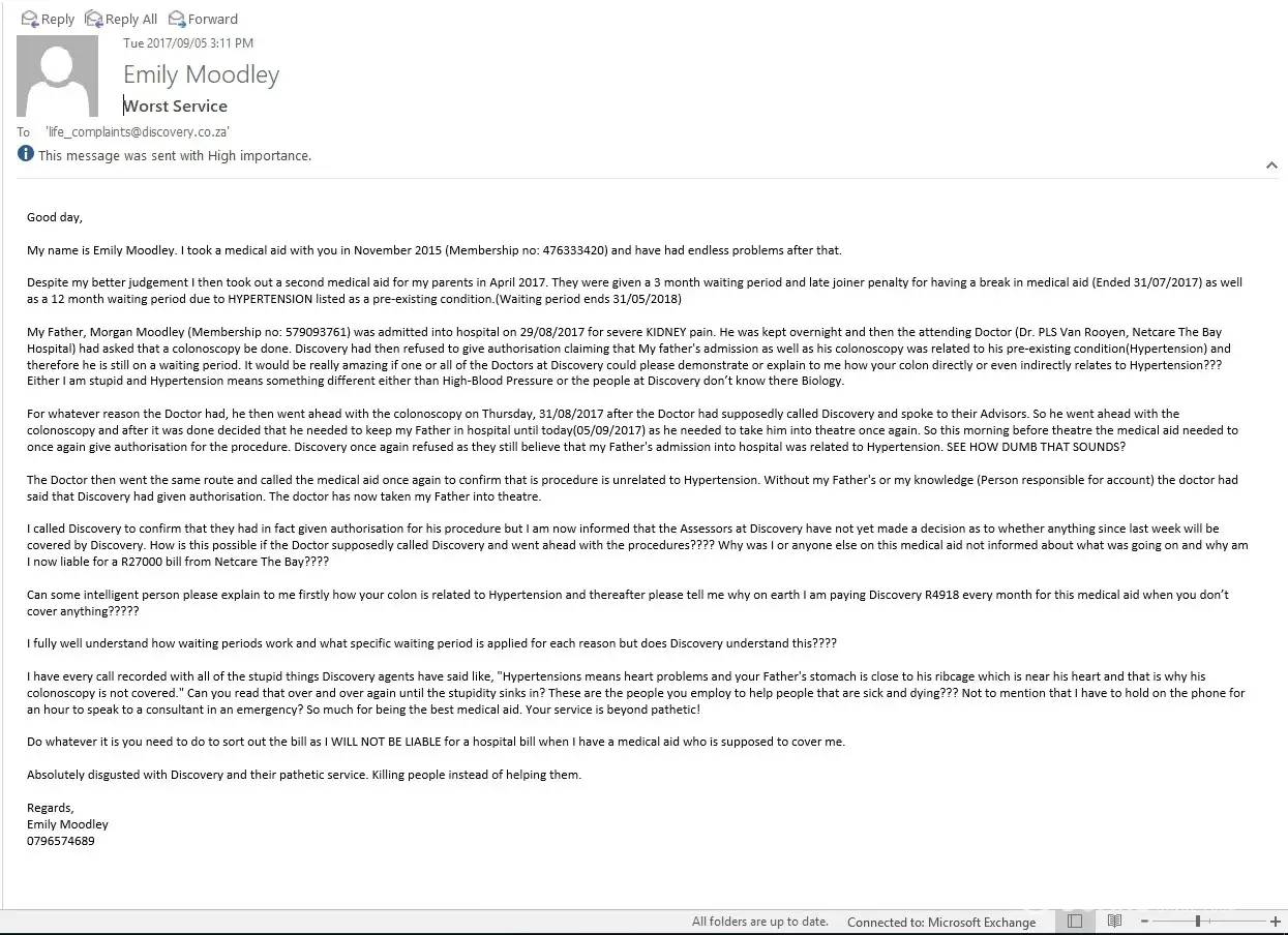 I am sick and tired of sending emails to Discovery regarding my chronic claims problem. WHY does no one answer me? Discovery service is now disgusting it used to be the top med Aid but now it is at the bottom of the list. Are there no senior officials who are supervising? What are they being paid to do?