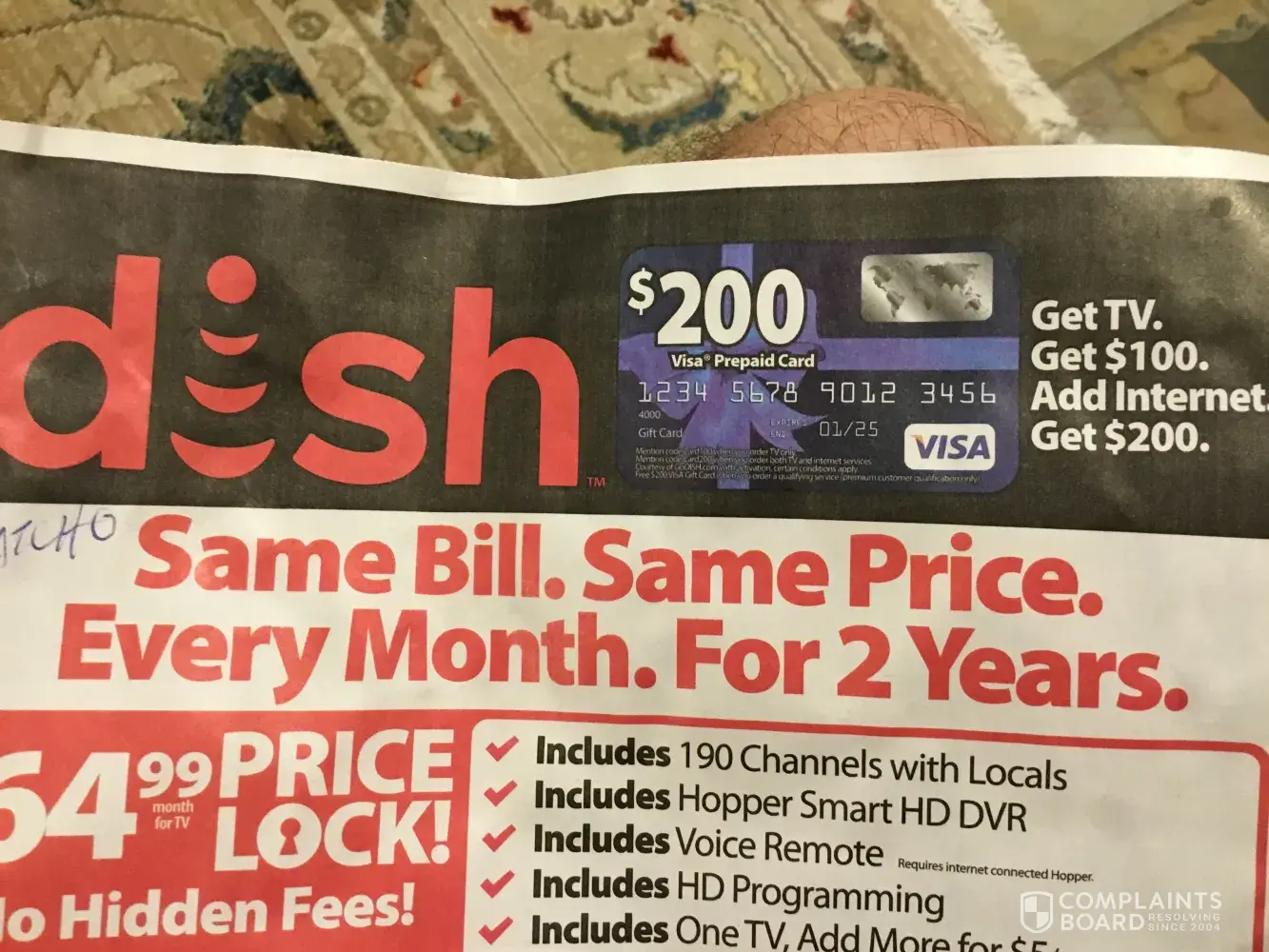 Dish advertises they give a $200 prepaid Visa card for signing up for their satellite tv service plus internet. When I called them asking about it, they said I needed a code found in some letter they send. The advertisement says to mention code "card 200" when ordering. I've called four times and in their company notes they have my previous call on record concerning my request about the card but they always play dumb and deny they know anything about how to get the card. It's just really strange. They advertise one thing and plead ignorance when asked about it.