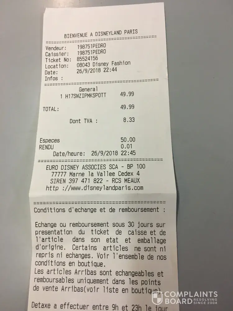 Disneyland Paris sent an automated email saying that it is about 15 days to get an answer. Sound a bit too long... anyways, they wrote back asking for pictures of the jumper and the receipt of purchase. I sent these to them and ever since nothing happened.