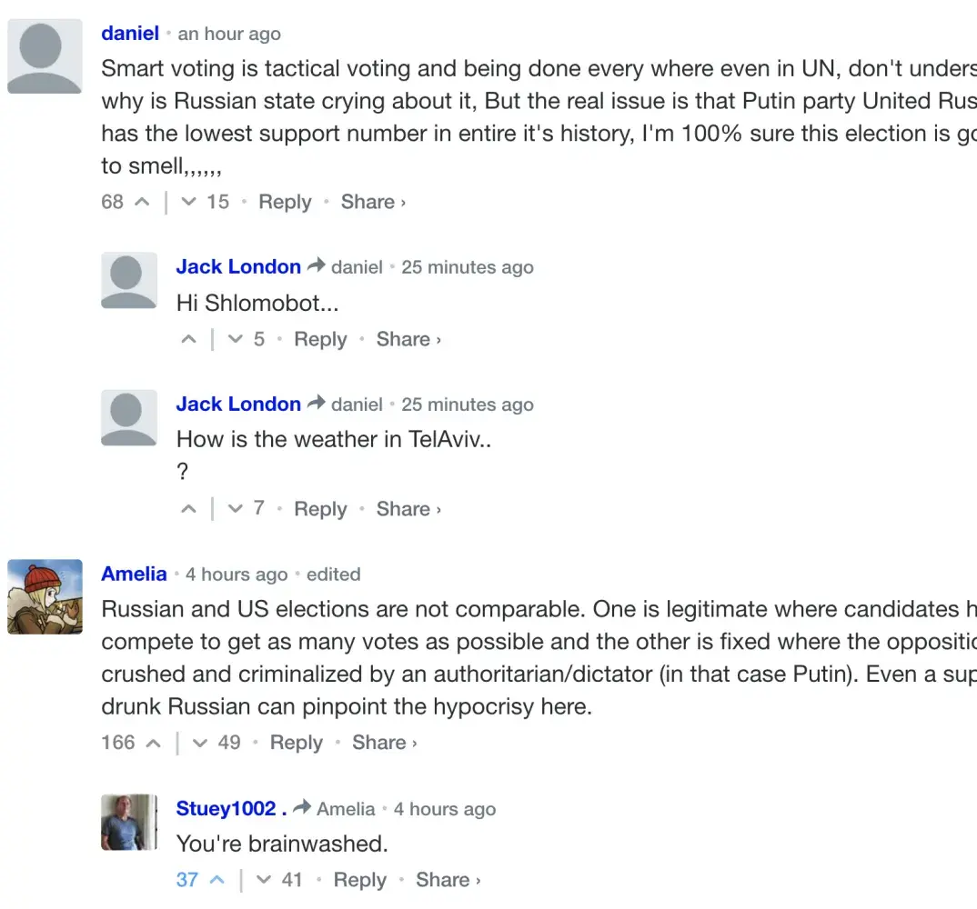 Todays article: "America & 44 other countries demand urgent answers from Moscow over ‘attempted assassination' of jailed opposition figure Navalny". Commenter Chiefless, went from 162 votes to 413 votes in a2 seconds. UKtime Traveller & olganfreak also received unusually high votes while those replying received very high down votes.