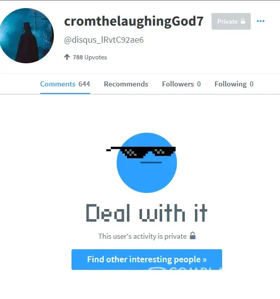 I have someone impersonating my profile. I used the report feature and nothing. Now they are harassing other members on a site pretending to be me. It is bullying. Disqus has not done anything. The fake account stole my name picture etc. They can change it if I change it and presently they are trying to ruin me to other members I have known for years. I am the original cromthelaughinggod7 and this guy won't go away. Please someone from disqus remove this troll account. I am seriously thinking about taking action. I took a screen shot of the fake account below. I have 28 thousand votes on my profile and started in 2013. He is causing damage on the site.