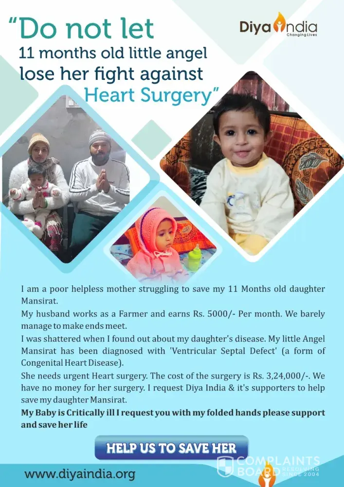 Greetings from Diya India Foundation. We need your support for 11 months old baby girl Mansirat Kaur, who needs an Urgent Surgery for her heart disorder. Escorts Heart Institute has informed that the cost of the surgery is Rs. 3, 24, 000/-, and the family has asked our NGO to help them urgently as they can't bear the expenses at all. Due to the coronavirus pandemic, it is extremely important for the surgery to be done as soon as possible. Kindly help this little soul begin this new year in a healthy way by helping us arrange funds for her surgery. Sharing the detailed reports with you.