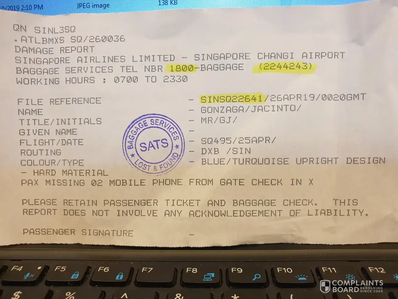 Immediately i filed a complain at Singapore Airlines Lost and Found Section. A copy was attached on this complaint report.