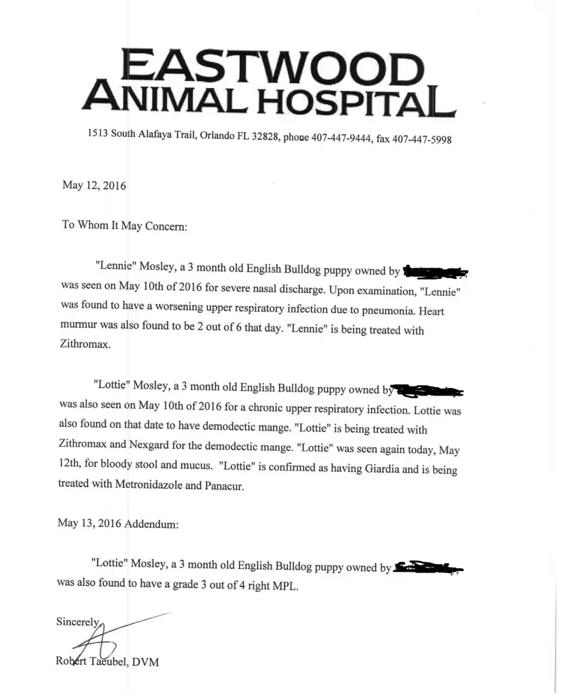 I purchased 2 english bulldog puppies on 4/8/16. I got two very sick puppies with Mange, pneumonia, and a host of other infections. The female has a luxating patella MPL a grade 3 out of 4 in severity and the male has a grade 2 heart murmur. I was told by Michelle the breeder that she would make this right by giving me healthier puppies or a partial refund...
