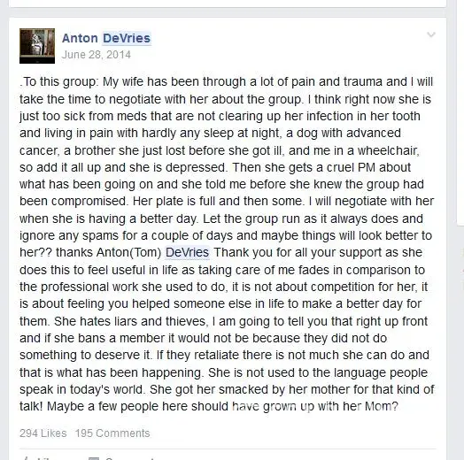 Lori A DeVries is a puppy mill breeder that has falsely attacked others on Facebook, she is a well known heavy drug user, which her husband Anton Devries now past away posted this in the group Pomeranian Lovers Of America, Which now the name of the group has changed to MILK's Pomeranian World, Lori A DeVries had to step down as a admin her own group due...