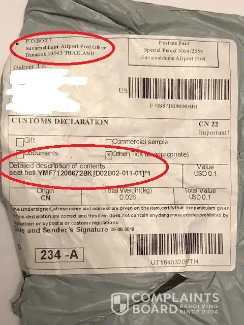 Picture #1 is a picture of the packaging that the "Premium Seat Belt" came in... notice the return address... Banakok, Thailand. Pretty sure it's Bangkok but what do I know?!?
