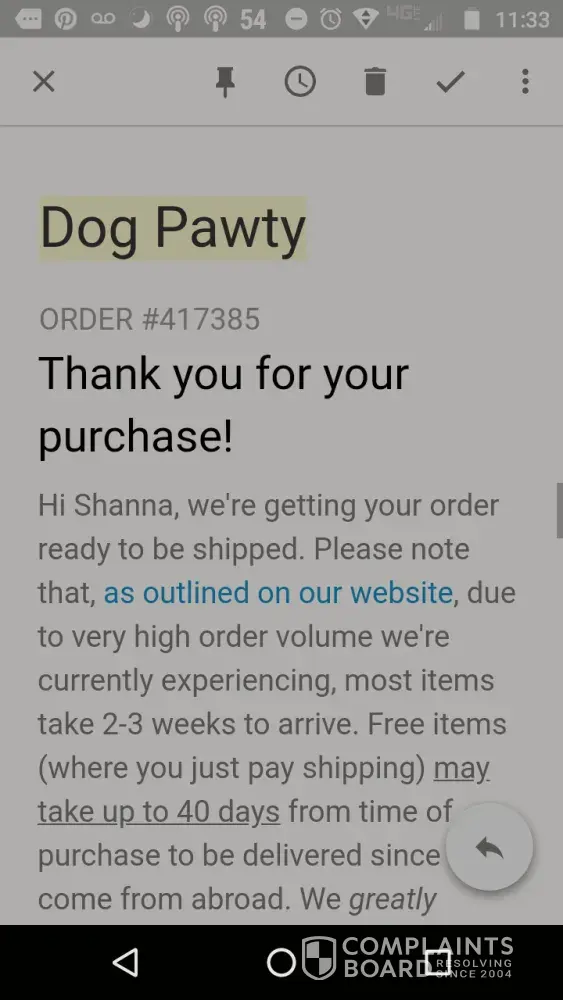 I bought the dog paw ring for $9.99 back in May 2018, and in June I emailed to dog pawty a ticket asking where is this so called ring at? And I get an email response that says these items come from overseas (china ) and it can take up to 45 days to receive, and if I don't get it after 45 days to send another " ticket." Omg, give me a break ! This company has no customer service phone number., and several people are not getting their orders from this company ! The bureau of consumer affairs needs to be made aware of the faulty business practices of this organization !