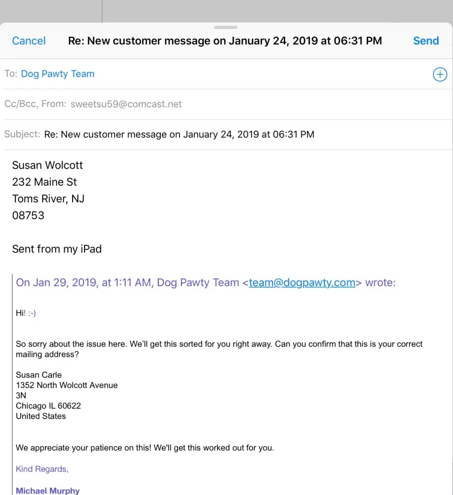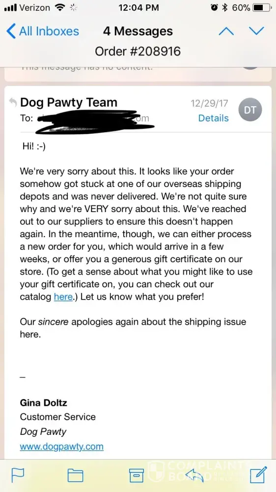 I ordered a dog collar on September 24, 2017. The collar arrived broken. I contacted their customer service department and submitted a "ticket" on their website, (and included photos of the broken product and order number) several times but never received a response. Then I emailed the company directly explained the issue. I was ignored several times, and then on two separate occasions I was told that they would send a replacement in 12-18 days. So I waited each time but nothing came.