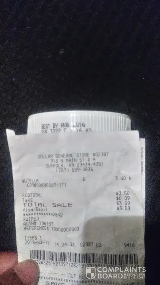 Today on march 19, 2018 I went to dollar general on north main street suffolk, va 23434 and purchased one jar of nutella I didn't bother to check the date because I was in a rush and it was the only item I was getting and mainly because it was the first one on the shelf (should be safe right) no after a few hours I decide to get sone and when I opened it the gold seal had already been peeled open to the middle and that made me curious to the the date and it said august of 2016 I am very disappointed because I love nutella and it was the only item I brought it was as if the stocker peeled it back smelled it and decided that it was fine to stock up the entire shelf with nutella from 2016. This isn't the first time this is the second time it has has happened the first time I brought cake frosting from the same location got all the way home baked the cake tasted the frosting and it was gut wrenchingly disgusting and that too had a date of 2016! I am not their only customer this has to be happening to others! Don't these stores recieve inspections? Does anyone care? Something needs to be done! After I get my refund tomorrow I will never be returning to this dollar general location ever again and I will be spreading the word on my social media to warn my fellow people of suffolk va.
