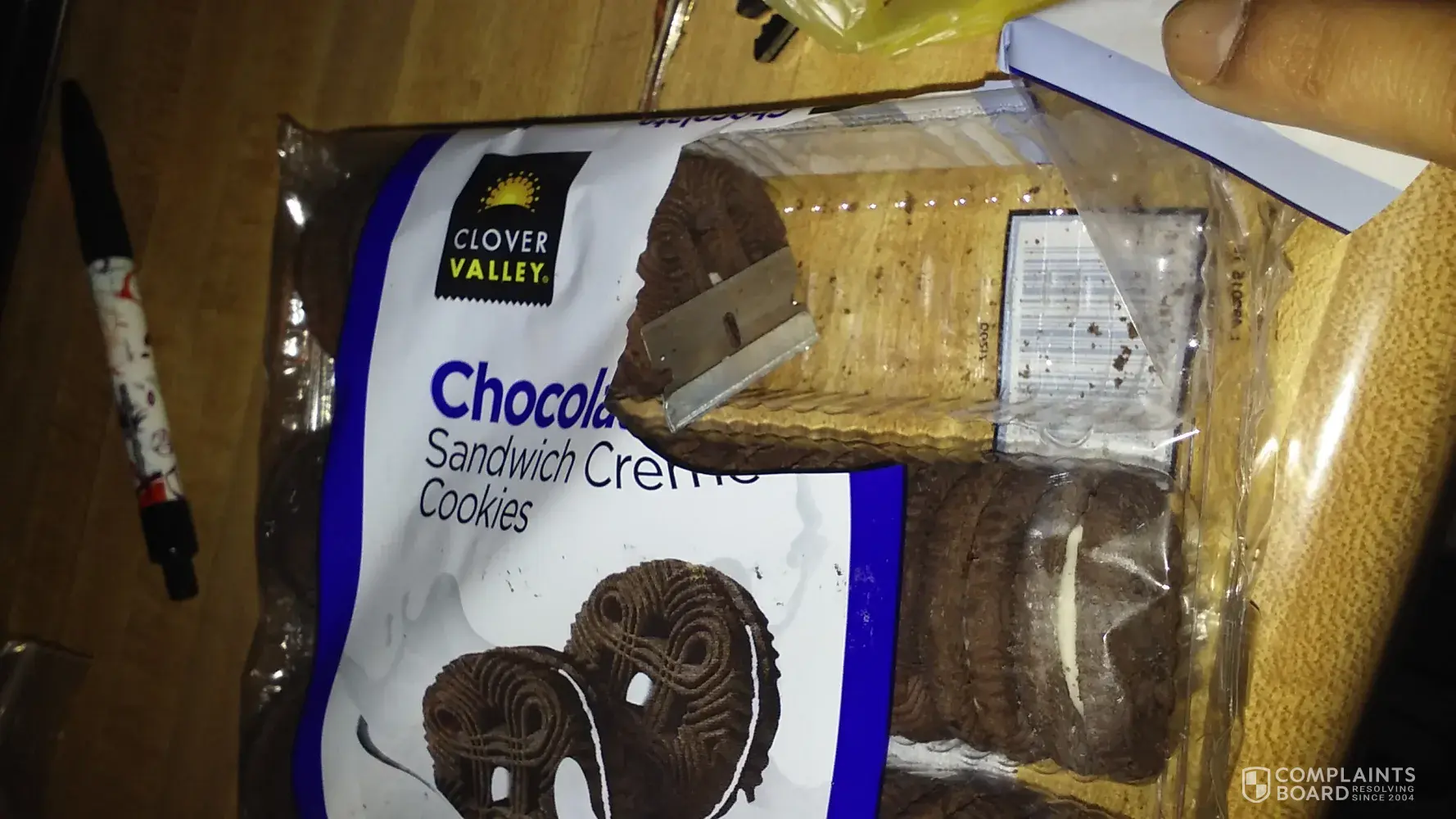 I purchased a 13 oz package of Clover Valley Chocolate Sandwich Creme Cookies from the Dollar General and when I opened the package when i arrived home, i took 5 cookies out and was about to hand them to my 4 year old when i noticed something silver in the pack! It was a RAZOR BLADE! Wth is a razor blade doing in a package of chocolate cookies?! Very disappointed & PISSED about this! What if my 4 year old had opened the pack instead of me?! I took pictures and will spread them to let everyone know about this! And its not the stores fault! It came from the manufacturer like this!