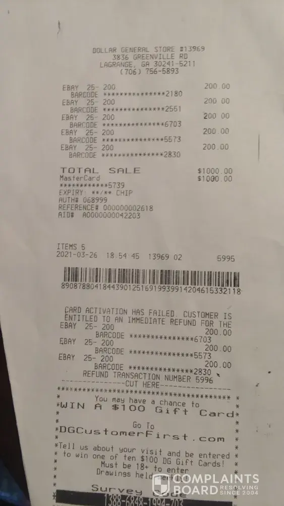 On 3/26/2021, I attempted to purchase $1000 in ebay gift cards, five $200 dollar cards. Two of the five cards were activated. Three did not get activated and the register said refund customer the $600. The cashier hit the cash out button. Then stated she couldn't give me the cash because I paid for it with my debit card. Which I understood. She contacted...