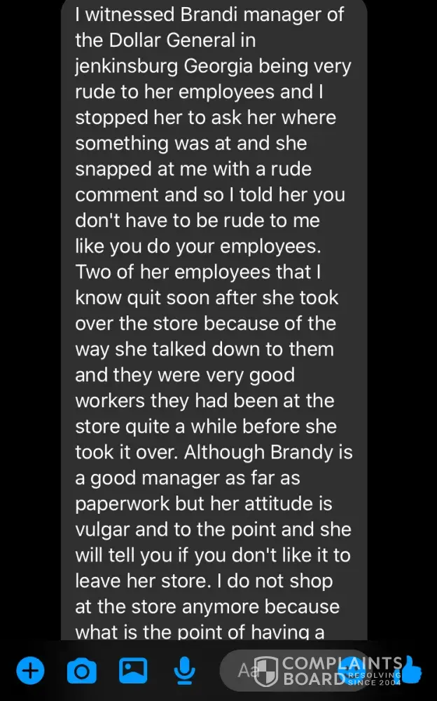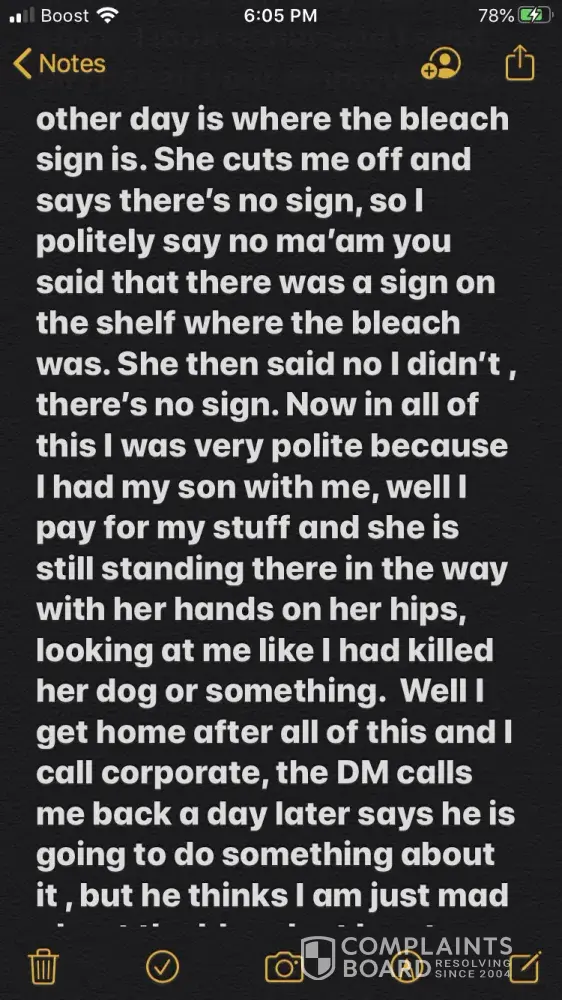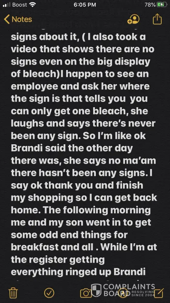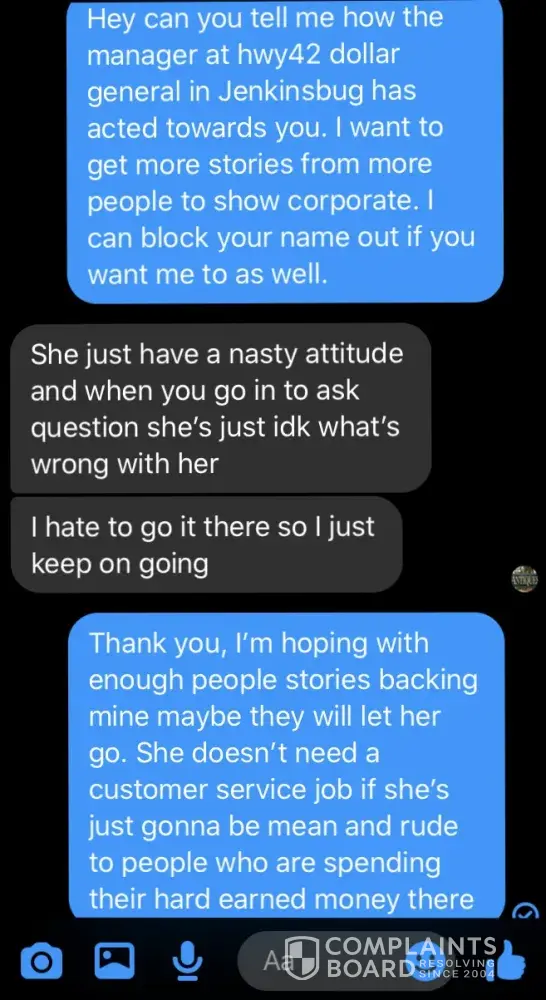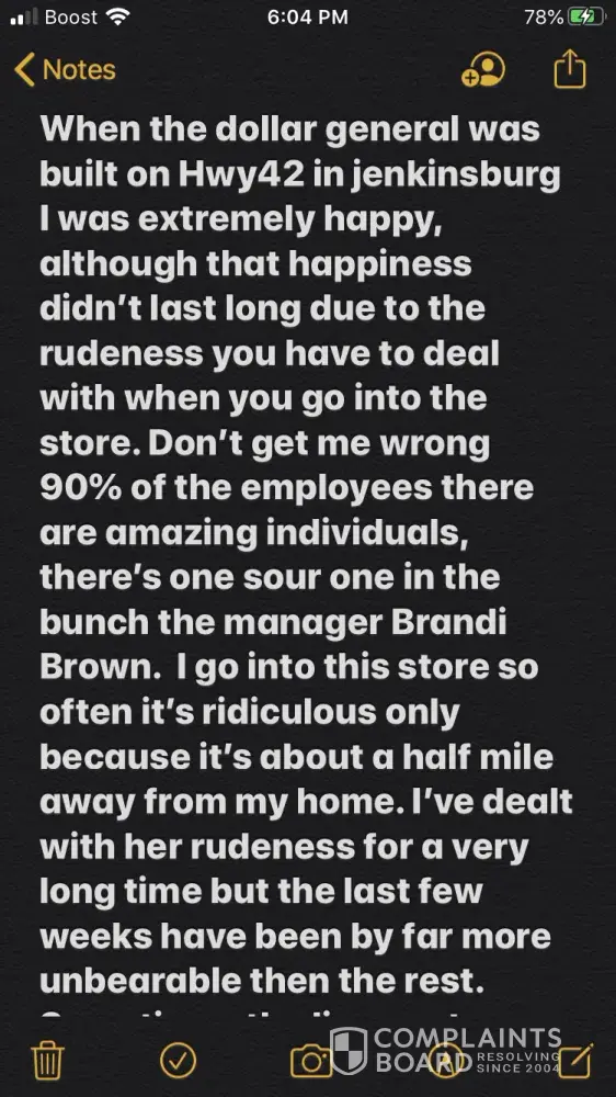 I have talked to the DM in my area about my issues. But I want to show the Dollar General corporation what's going on in Jenkinsburg Ga. I have blocked out names for privacy reasons. I also wrote my own "complaints" in my notes will also be sending that as well. If you need anything else my Email address is [protected]@gmail.com