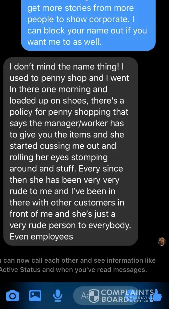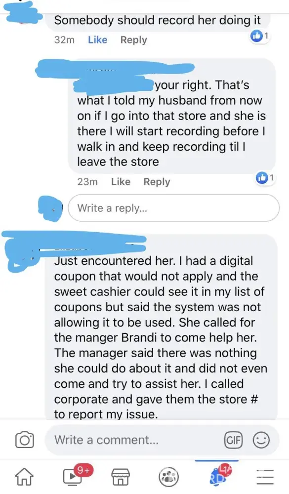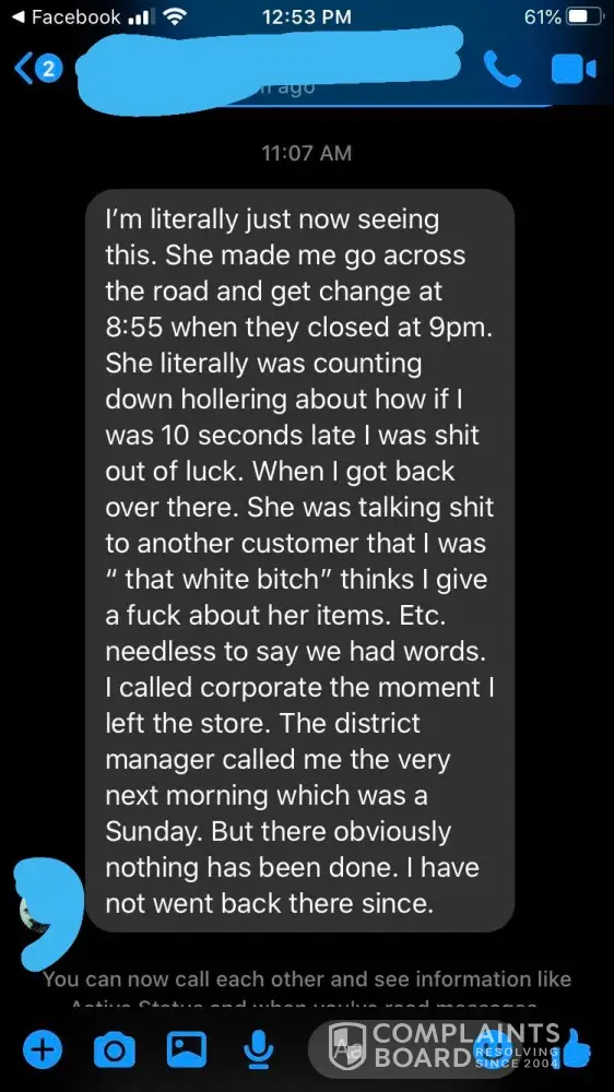 I am not one to complain at all and out of my 28 years on this Earth, this is the first complaint I have ever lodged but I feel the need to because I no longer feel comfortable shopping in my local store. Unfortunately, until she is either reprimanded for her actions or replaced entirely, I will no longer be bringing my business to this company.