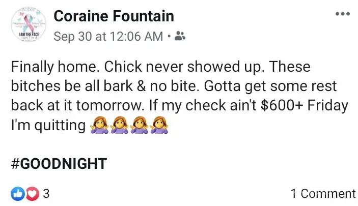If you are going to be a manager...you might not want to lose your workers because you are selfish. I was told by her that she is willing to work with me while I am dealing with issues with my children and apparently helping me is terminating me. I was hired August 1st of 2019, and as of October 14th of 2019 I just today recieved verification that I am no longer employed by her store. There are lots of issues with her with numerous individuals and she shouldn't be allowed to treat her employees the way she does.