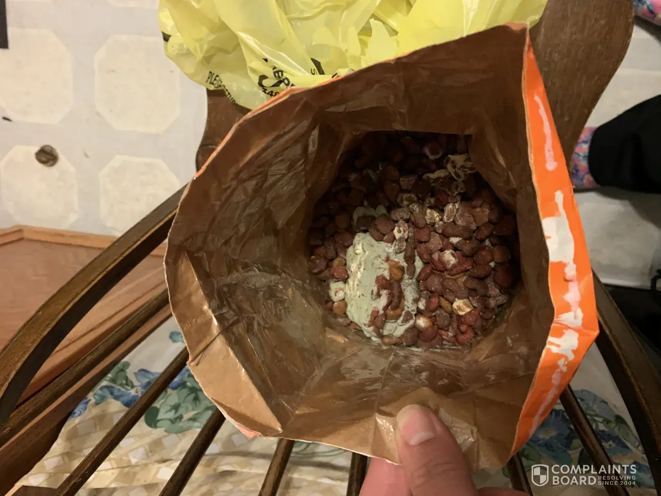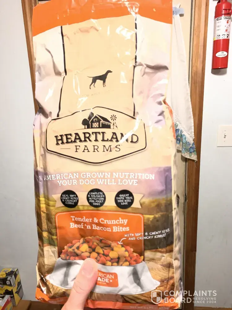 I stopped to get a bag of dog food and chose the heartland farms. When I got the dog food home I opened it. When I dumped the food into the bowl it was a giant ball of mildew. The bag was sealed, no tears or any openings. This was totally disgusting. After a long day at work this is the last thing I wanted to do was go back to store to get more dog food.