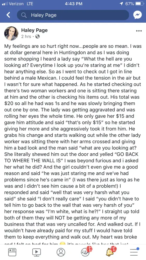 There is a Facebook post by Haley Page that need to be check into. Two female worker in Huntingdon TN treated a man very poorly due to his race. The things that were said to him were very inappropriate. Something should be done about this kind of behavior. This is a copy of the post "My feelings are so hurt right now...people are so mean. I was at dollar general here in Huntingdon and as I was doing some shopping I heard a lady say "What the hell are you looking at? Everytime I look up you're staring at me" I didn't hear anything else. So as I went to check out I got in line behind a male Mexican. I could feel the tension in the air but I wasn't for sure what happened. As he started checking out there's two woman workers and one is sitting there staring at him and the other is checking his items out. His total was $20 so all he had was 1s and he was slowly bringing them out one by one. The lady was getting aggravated and was rolling her eyes the whole time. He only gave her $15 and gave him attitude and said "that's only $15" so he started giving her more and she aggressively took it from him. He grabs his change and starts walking out while the other lady worker was sitting there with her arms crossed and giving him a bad look and the man said "what are you looking at? She literally shewed him out the door and yelled "GO BACK TO WHERE THE WALL IS" I was beyond furious and i asked her what he did? And the girl couldn't even give me a good reason and said "he was just staring me and we've had problems since he's came in" (I was there just as long as he was and I didn't see him cause a bit of a problem!) I responded and said "well that was very harsh what you said" she said "I don't really care" I said "you didn't have to tell him to go back to the wall that was very harsh of you" her response was "I'm white, what is he?!" I straight up told both of them they will NOT be getting any more of my business that that was very uncalled for. And walked out. If I wouldn't have already paid for my stuff I would have told them to keep everything and walk out. My heart was broke and I felt so bad for him 😞 it's people like her that just crawl under my skin! all I could do it cry bc people are just so mean and hateful and don't care 😞"