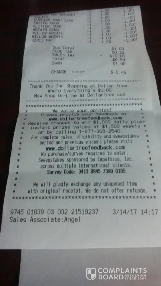Dollar tree store #4560, 880 nw 125th street, north miami, fl 33161, [protected]. 3/01/17 13:09. at 1:09 pm I checked out with a total purchase of $4.28. I gave the cashier yulith $5.28 and she returned my $1.00 change to me. receipt # [protected] [protected]