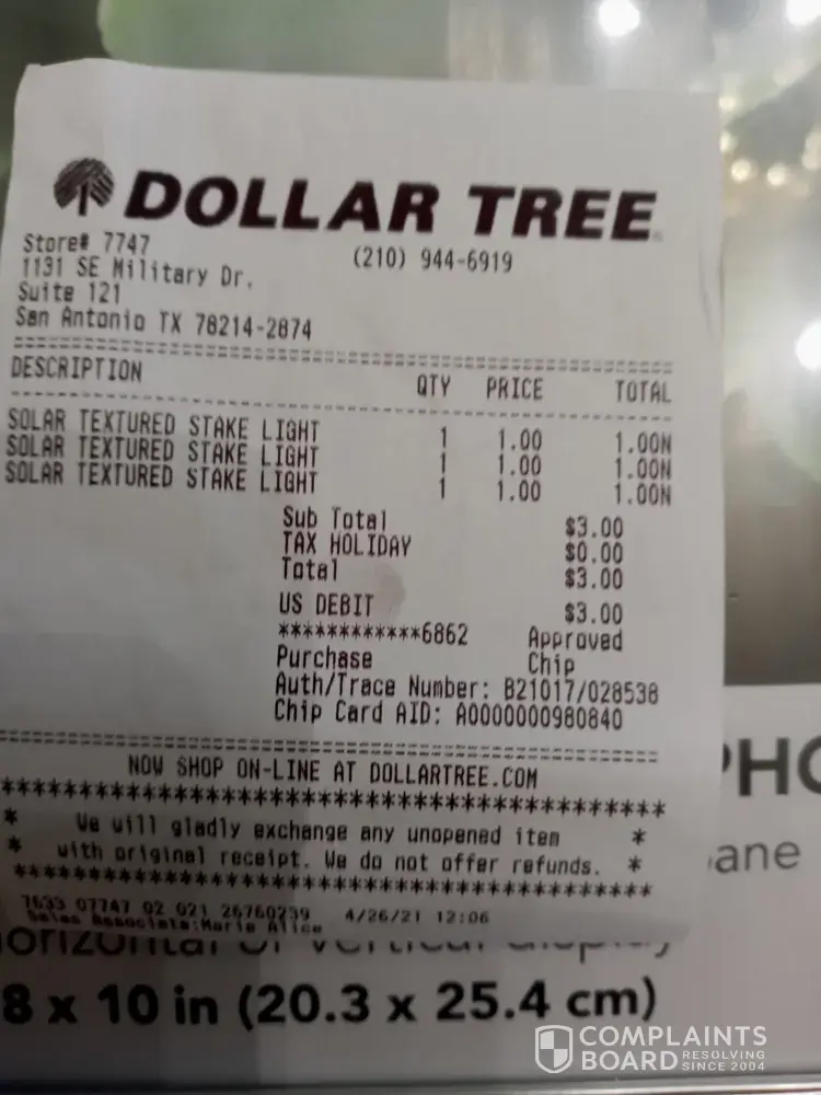 I felt that I was treated unprofessionally from the store manager, that had no name tag, and kept emphasizing that she was the manager but did nothing to look and see that the store stock was also broken. This [protected]@ store#[protected] SE Military Dr. Suite 121. San Antonio, TX [protected]. I've always been treated with outstanding service at this Dollar Tree in my neighborhood. I purchased these frames on 04/20/21. To top it off, when I walked in the store an associate looked at my return and approved it. His initials was RT on my receipt and told me to get what I needed. After my transaction was done, the manager put the two broken frames and the unopened one with my receipt into the original bag, gave it back to me and the cashier charged me for three solar light that I had exchanged it for. That was a total embarrassment to me and because I asked why, the manager said I know its not right, but that she did not make the rules dollar tree did on the receipt. When you put " no unopened items are exchanged". But clearly your store stock are broken through the see through package, something I did not noticed. Clearly when you hire managers you need to give them full empowerment to make the right decisions for the integrity of the company. Unfortunately for me I got the raw end of the stick.