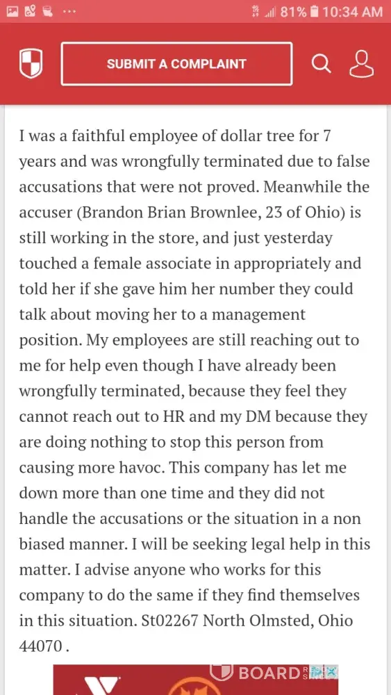 Wrongfully Terminated due to false accusations. HR Michelle Gaby spoke to me in a condescending tone and did not treat the situation in an unbiased manner. I have been an employee with the company Dollar Tree for 7 years and never had an issue with anyone I have worked with within the company. I was terminated on false accusations and no proof of the...
