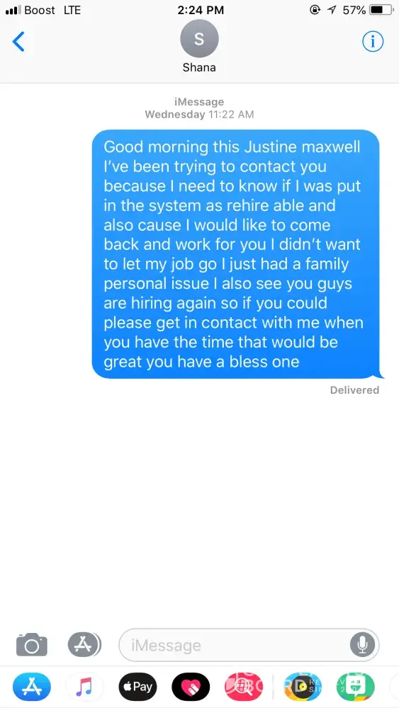I was hired everything was great but then a personal family issues came up so I had to leave the job now I'm trying to get hired in a different store or the same one and I tried to contact the hiring manager and I also sent out a text to her phone and I was blocked with no response to any of the question I asked her even wen I was waiting there it was really hard to get in contact with her and she barley was at work she barley was giving me hours I don't believe that she fit to be a hiring manager I would appreciate it if someone look in to this her name was Shana I added the photo from wen the text was sent now wen I call it goes straight to voicemail so I called private and it was ringing she answered I asked for her and she hung up on me that really bad for business