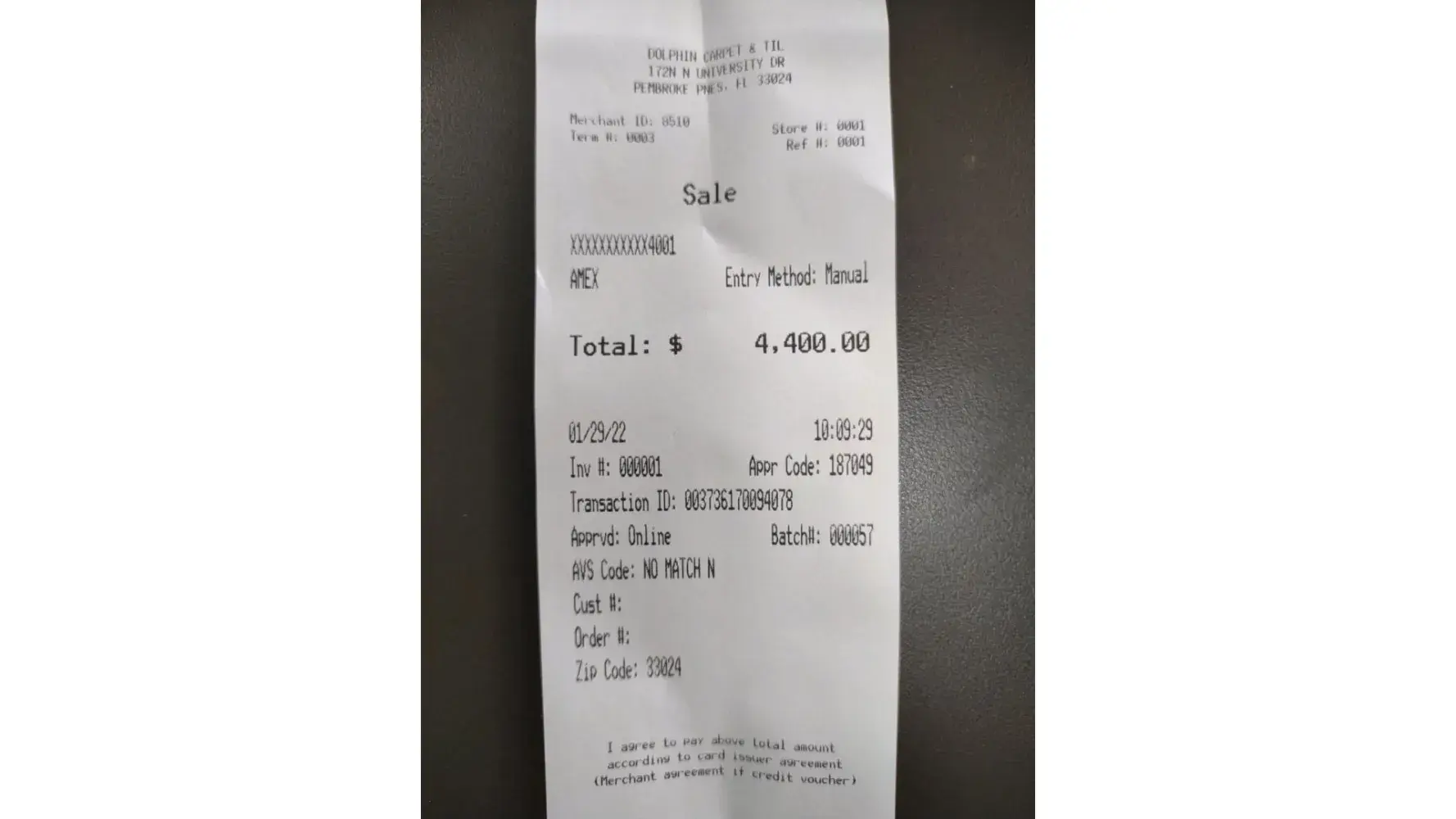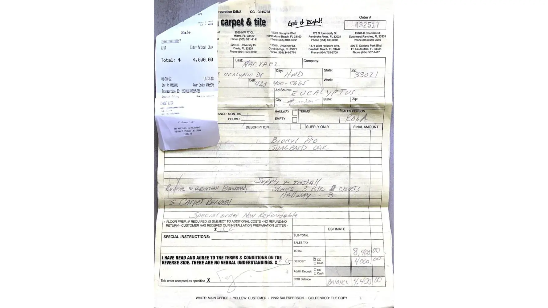 Our order #432517 To : 1203 Eucalyptus dr , Hollywood, FL, zip 330021 Was placed on 01/10/2022 in the amount of $4000 and was scheduled to be installed on 1/28/2022. On 01/28/2022 no one came to insatll our flooring. We were not informed from the evening of 01/27/2022 that the workers will not be coming on 01/28/2022. In this regard, my husband and I lost our working days. On 01/29/22 (Saturday) a team of workers of 3 people arrived. Husband paid $4400 I accepted the color of Bionyl Pro Lamina Sualbard Oak which matches the selected color. Due to the fact that they did not speak English, I showed them my order #432517 , signed for the color of the laminate and pointed to remove and reinstall the baseboard as indicated on the order. We were convinced that a professional team would come and do everything that was as ordered on the receipt which we paid . After 3 hours of work, I went up to look at the work and saw that they did not remove the baseboards as per the work order. When asked what they were doing, they showed the moulding that I did not order. We spoke through an interpreter as no one could speak English. The Flooring was already laid by about 30% and of such quality. On my claims, they collected their things and left. (and this was quite aggressive on the part of the workers) So they left us for the weekend 01/29/2022 to return on Monday (01/31/2022). After a call from store manager Rob Apakian in a rude form, he said that he would not dismantle the floor and we would continue work on Monday. We had to go to the store and buy new molding for the amount of $350.00. Receipts are available. On Monday 01/31/22 the same group of workers came and continued to install the floor. (+1 new person) They finished the job within a day. I couldn't see how much they corrected their mistakes. Since there was no opportunity to go up and check due to work on the stairs. I accepted the work in this form (2 slats of a different color and another forms) 2 lamps were knocked out on the ceiling The walls were left in this state along the entire corridor The wall was left in the locker room In the form of door jambs So the space between the doors and the floor was closed We were assured that if there were any problems on the floor we would the opportunity to get it fixed through the developer company, but it did not happen. Laminate was laid on such a floor. No one called us after the work was done, no one offered to recalculate the rails that were not ordered. Please apologize for the wrong order. I am very sorry that I chose your company to do this job. My family has a lot of experience working with different companies and we have always been 100% satisfied with the personal approach to our orders. We received an incorrectly executed order from you for full payment work in the amount of $ 8400 and a rude attitude towards us, the client. Dolphin Carpet did not live up to the work that was promised in writing forcing us to spend extra money for completing a job that was not only done at the promised time but also as I mentioned cost us a days wages.Thank you My phone is [protected] Rafael Narvaez. All photos and videos are available . If you are interested to see.