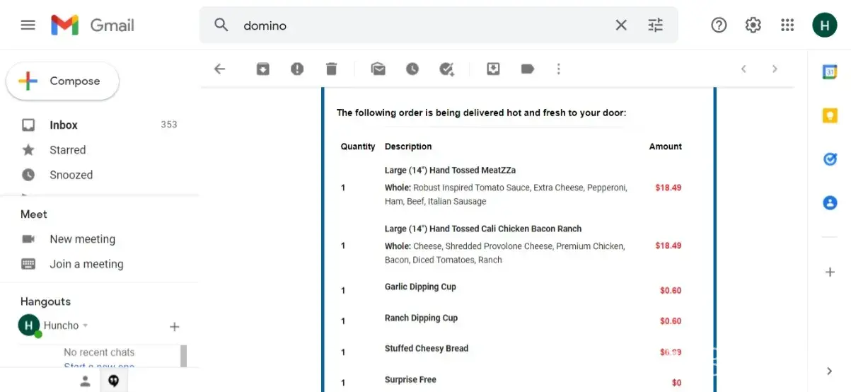 The Domino's email receipt says 1:25AM.