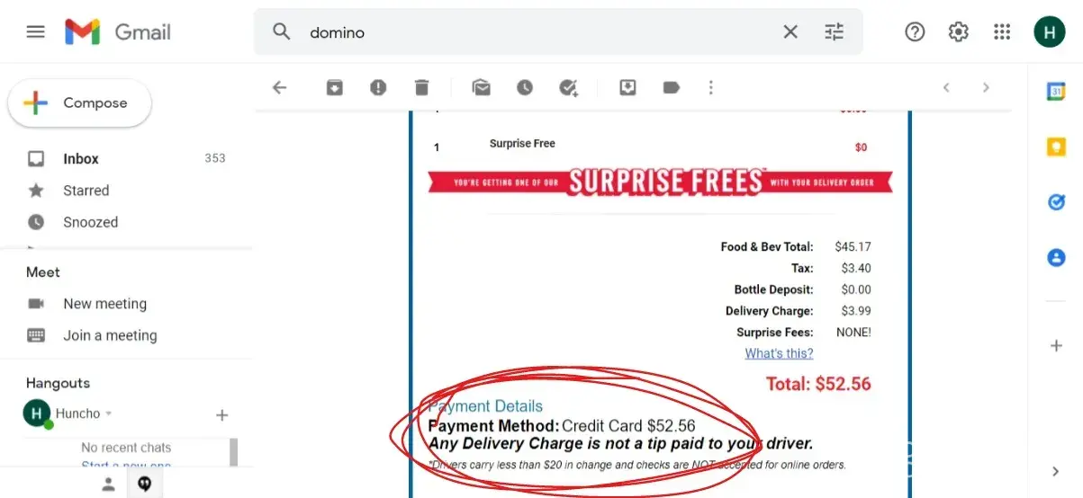 The domino driver took my $54.38 for my order and domino still charged my debit card for $54.38