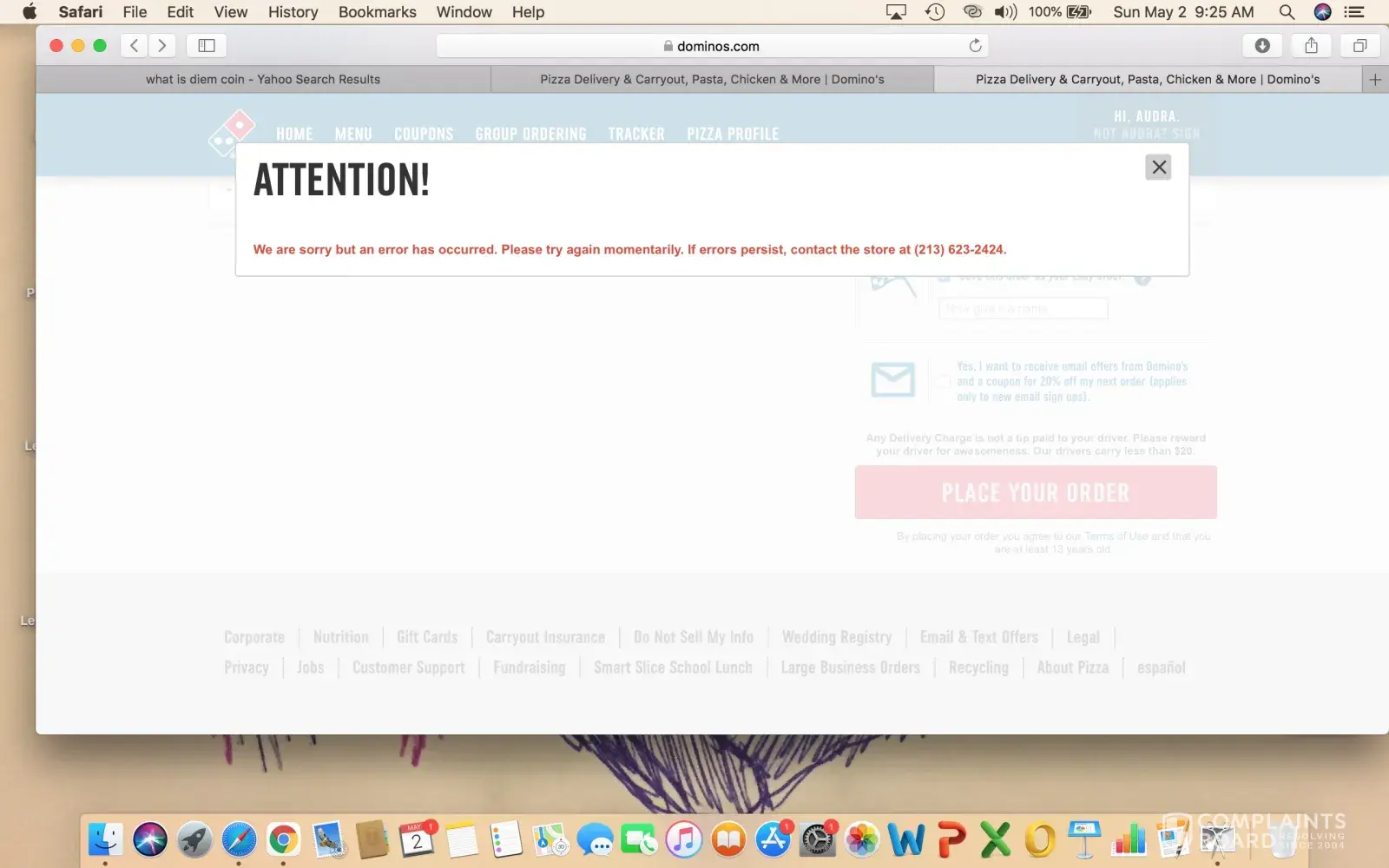 Read full complaintI am supposed to have credit for two large pizzas and a two liter