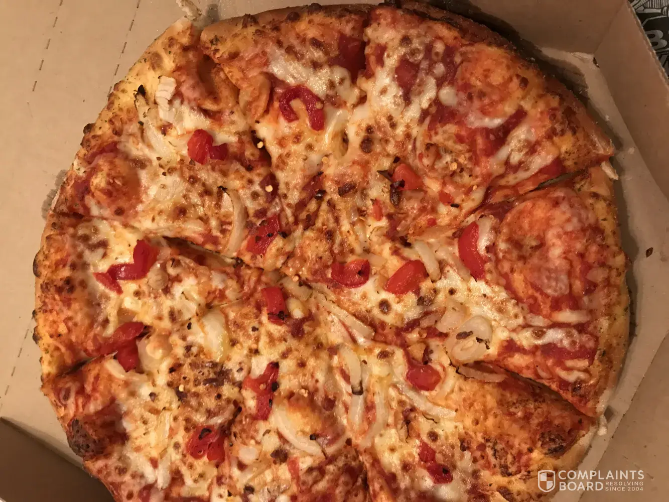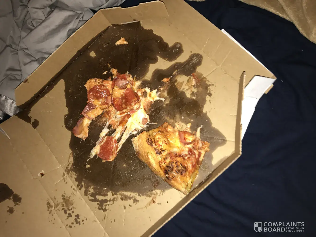 The pizza was delivered and half of it was upside down with cheese sticking to the bottom of the box. The quality of the pizza was also really bad with a hair sticking out of one slice and additionally the pizza was cold by the time it arrived. I have attached a picture with this message.