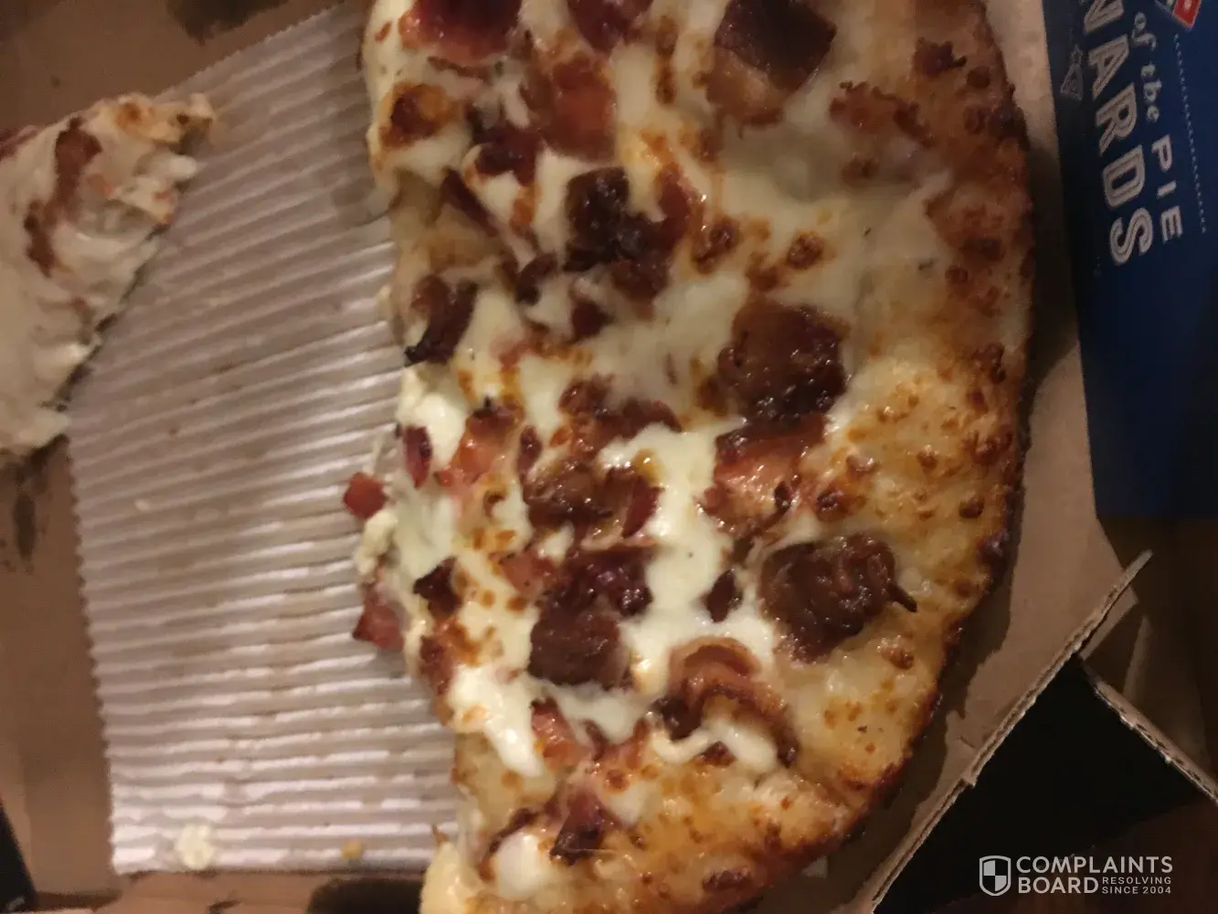 I had been rewarded a free pizza from the Dominos right next to my apartment. I picked the pizza up from the store and when I got back I opened it and the whole pizza did not look appetizing or like any effort was put in it. Also, one piece in particular was only half cut and the other half was melted to the bottom of the pizza. The entire pizza itself did not taste appealing and appeared to be undercooked. I normally don't complain but I thought I needed to since it was an earned pizza by purchasing multiple pizzas from my account.