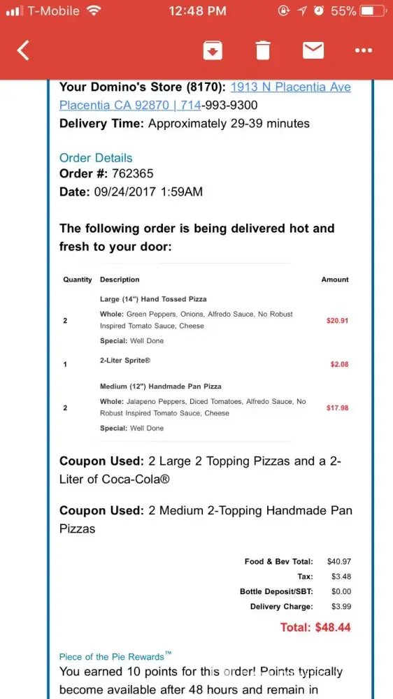 This was my free pizza after placing six previous orders in the last month. The driver said he could throw the order out so I wouldn't be charged. That would be great if I had paid for the pizza. But I used my points. The points I earned from six other large orders. I want my points back, and some kind of effort to make up for the the last two orders, not a free, free pizza! I sincerely hope someone reaches out to me to make this right, or last night's order will be my last order.
