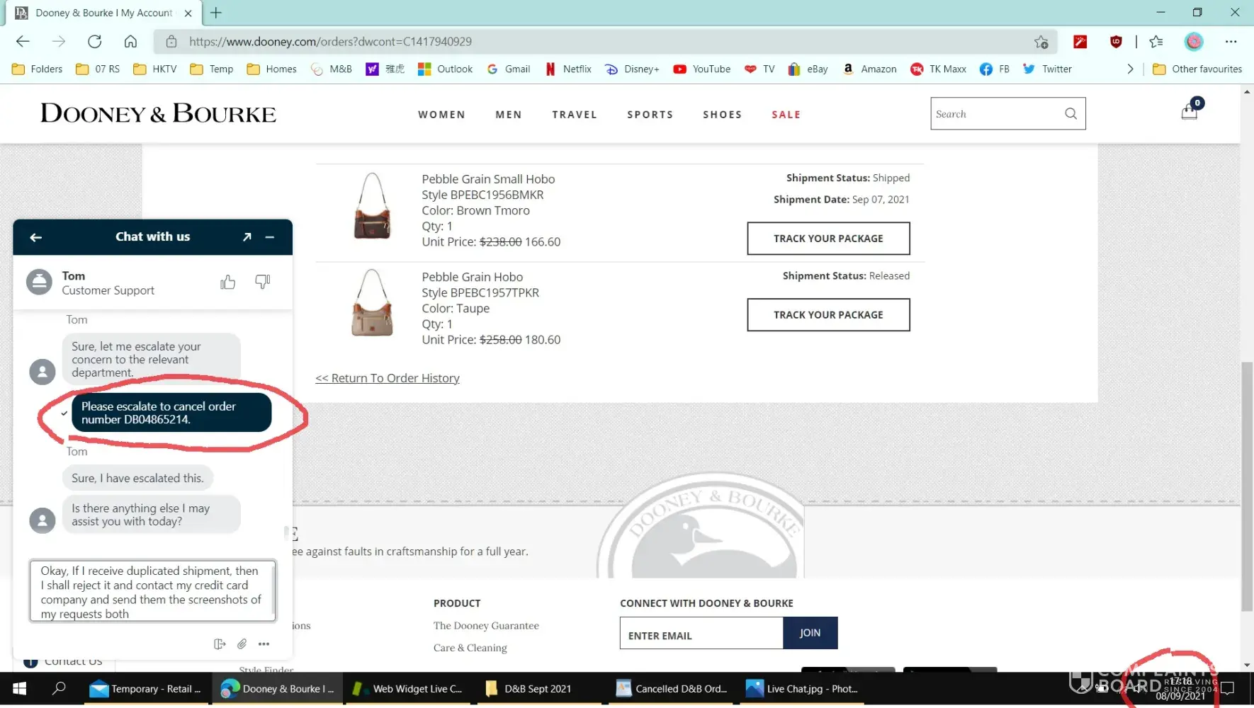 After much confusing correspondence with Tom via Live Chat, I requested cancellation of both DB04857374 + DB04857395 Orders.