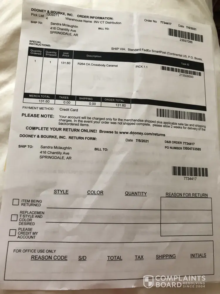 On April 27, 2021, I ordered two items from Dooney & Bourke and I mistakenly put in the wrong shipping address. I noticed the mistake and called the company the on morning on April 28, 2021 and was told that they would update my address and send items to correct address. I was given a tracker ticket number 332359. I have called again on May 5, 2021 to get a status and was told that since it had not gone out it would be send to the address that I updated on April 28, 2021 and I was given another tracker ticket number 344272. My husband received a telephone call from the post office at Fort Meade, MD stating that they had a package but it could not be delivered since we had not lived there since 2019. I called D&B on May 5, 2021, telling them about the problem and was told to to call UPS asking them not to deliver, which I did and was told that only the company could make and request the change. I again called D&B and was told that I would have to wait about 2 weeks for them to find the problem and that I could be able to get a replacement of the items. Today, May 25, 2021, I received this email :