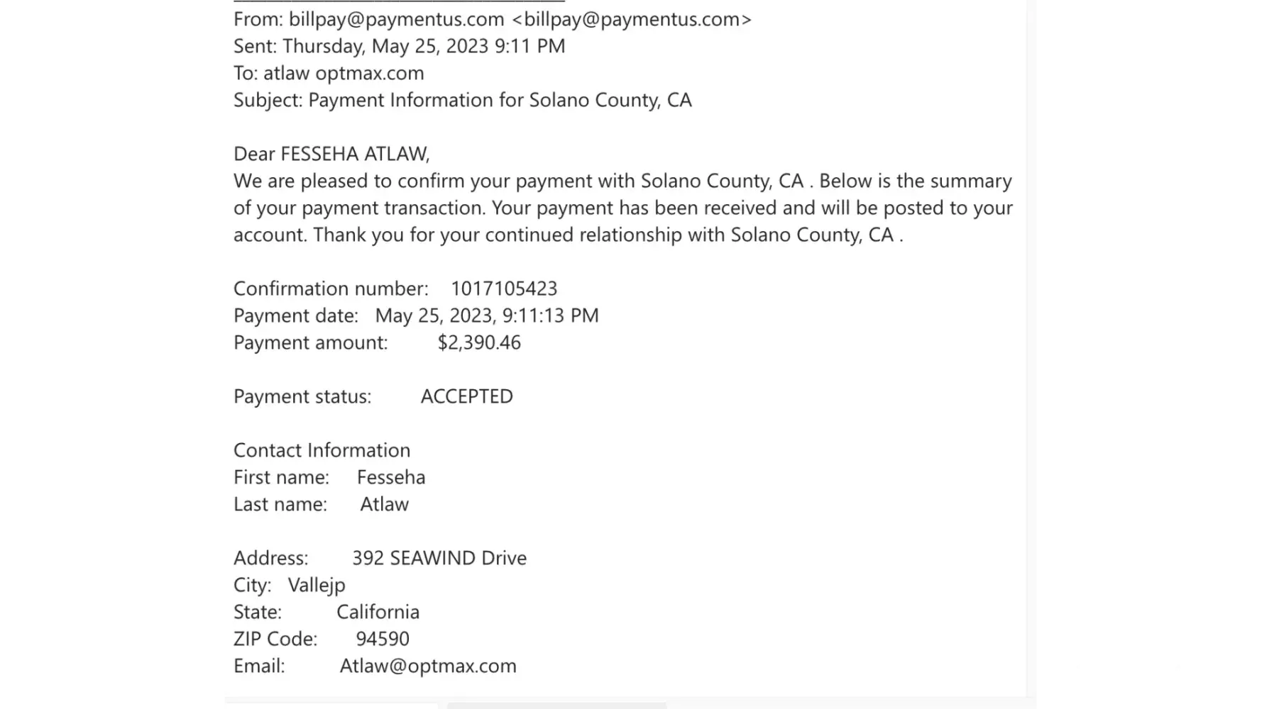 Subject: URGENT Fw: Payment Information for Solano County, CA