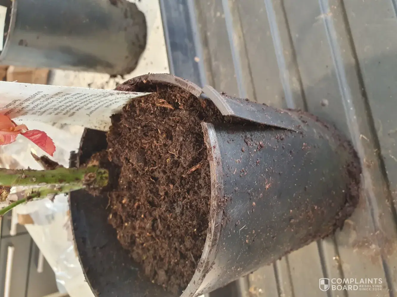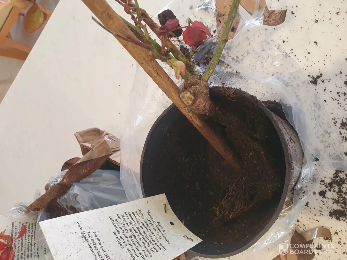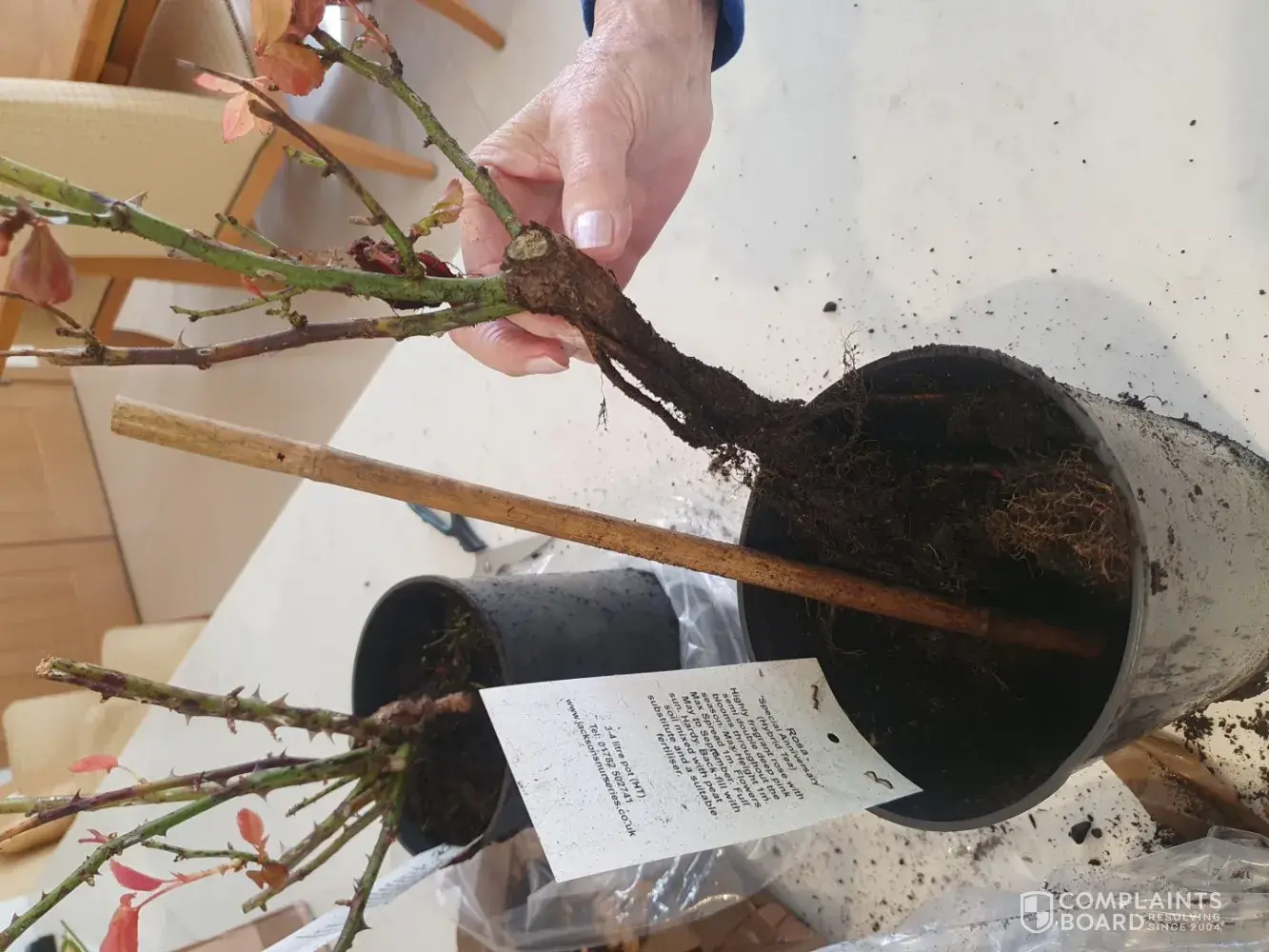 Three roses were delivered a week late and in very poor condition.  We were here but The delivery man didn't even bother to ring the doorbell?  I have enclosed photos.  One pot had virtually no soil as it was all at the bottom of the box. One other pot is split and damaged. One rose may survive (?), but I am not impressed at all. The soil is dry and...