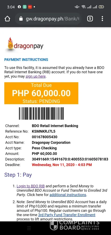 Payments has been made on Nov 10 for 100k over the counter from BDO to hotforex account via dragonpay which has not posted