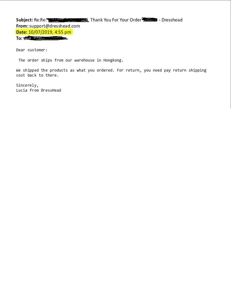 I place an order 2 + weeks ago, they advertise 1-3 days order will be shipped. I am still waiting for order just to be shipped! Email is down they say for maintenance and they won't respond to anything! I even tried to contact them via Facebook & nothing! I have NO trust in them now! Too Shady! They would at least give me a tracking number if they were on the up & up! I have nothing! Also am shy $235.67! That hurts! I am raising my teenage granddaughter, have been for 12 years! It's just her & I and I am on disability! She needs clothing and I need what I paid for! I hope they will listen to you. My next step is BBB & Federal Trade Commission ! I want a full refund and never hear about Dresshead again! Very Dishonest business, stay CLEAR !