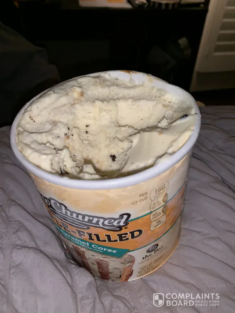 Unbelievable that there is absolutely barley any caramel. False advertising at its finest. I don't get ice cream that often and I was really excited until I opened it and found no caramel a few pieces of cookie dough and a ton of cheap chocolate chips. Even when I scooped a church out to see if there was any, just deeper down. And no! Obviously I can't return it. So i'm writing this complaint. That way you guys don't false advertise like this because it's unacceptable. Really really disappointed.