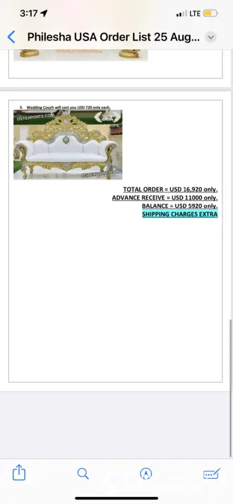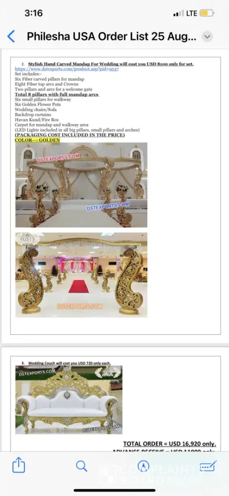 I ordered 5 stages in total. 3 are full mandap with sofa and everything and 2 are just the stage frames. I also ordered 2 dolis, punjabi statues and many small stuff for wedding. Anmol who is the owner of DST Exports, he said he will send everything with mandaps. But i did not get backdrop curtains. One mandap's whole big piece is missing. The doli bottom was broken. And the pictures he showed, the frames are not exactly the same. I can show pictures too. I guess what he does is, customer sends him a picture and he just tries to copy the design that is why there is a big difference in what he shows and what he delivers. We ordered in March and he said shipment will be delivered in 2 months. But he lied to us and we got the shipment in September. We could not do any event and paid rent for an empty office for 6 months. I will suggest everybody not to order big stuff from here, just order small things and PLEASE ORDER THROUGH ALI BABA OR ALI EXPRESS so if anything is broken or missing, a serious action could.be taken. I see so many good reviews but again, its a big investment, do not trust DST EXPORTS, order from ali express or Ali baba. I still message Anmol(the owner) and ask for the compensation. Everytime he says he's gonna do something about it but then he does not reply. Honestly I am disappointed. The worst decision of my life. Can we all do something about it? Can we sue them? At least we can get something back. I can provide pictures and proofs of the material.