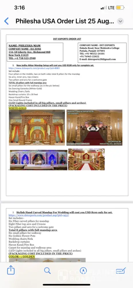So my mom and I traveled to Punjab last year April from NY and placed an order for two Mandaps. We were promised by Sukh Anmol that they would be ready to ship by the first week of June. We deposited $11,000 and still haven’t received our merchandise as yet and it’s February 27, 2024. Every time we contact them they don’t answer or they give us the run around. When they do answer they tell us the mandaps will be ready to ship in 10 days to send the balance of $6,000. Or we need to send them the payment for the container. I said to Sukh I will send payment but send me it through Alibaba with a guarantee ship date and I will send you payment. Then he disappears and I don’t hear back from him for months. I really would like like my mandaps or for DST Exports to return my $11000. They are not honest. They scammed us and I hope that no one does business with them.