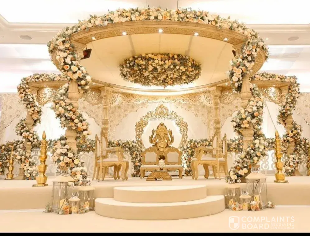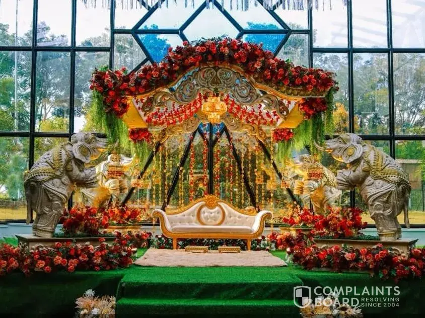 Out of all reported cases, 3 complaints (30%) have been marked as resolved, while 7 complaints (70%) remain unresolved. The most recent resolved complaint, Wedding mandap and backdrops, provides additional insight into how customer issues have been handled.