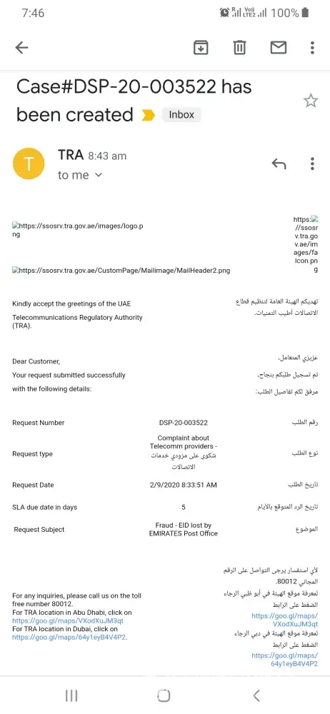 My Emirates ID was misplaced by Empost, Karama in 2018 and someone has used it in 2019 to take SIM cards and devices in my name from Du. I have reported this to Du in Feb 2019 (refer below e-mail sent to Du customer service in Feb 2019) and the last follow up from my end was made yesterday by visiting the Dubai Mall branch. Still, there is no positive response from their end and every time I visit or call Du, I have been informed that the case is under investigation.