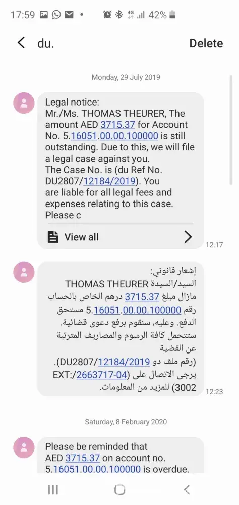 Hi. I have made numerous attempts to contact DU Customer care over the phone in February 2020 but am unable to get through. I keep receiving threatening text messages from DU asking me to settle a third party DU Bill. I had previously called up DU and reported this error in July 2019 and the constant threats stopped. Once again I have now received a threatening text message from DU stating that i have to pay AED 3700 plus legal expenses due to the account which is not mine and in the name of someone called Thomas Theurer of Mivune FZ LLC ACCOUNT NR 5.16051.00. This harassment is unnecessary and not ethical by a company such as DU. Extremely disappointing customer service. Not sure if this is a scam run by DU as it gives a number to call to settle claim. Very suspicious. About time DU look into company malpractice if this is happening.