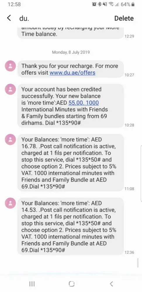 Everytime i recharge 25dhs you will always send me sms telling i subscribe to this and that even if im not!oh and by the way! There's not option to unsubscribe! So amazing! My last recharge is only 2days back and now my 25dhs is gone! Great job du! Your excellent in getting the money of your customer with your VERY POOR SERVICE! If you will continue to be like this! Better yet me and my husband change to ETISALAT!
