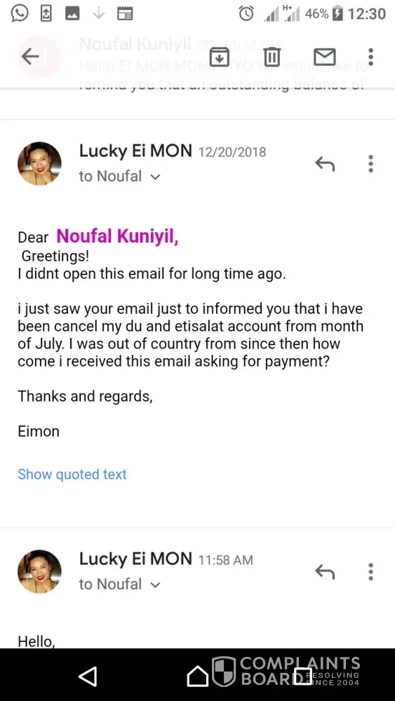 I received the email from Mr. Noufal (du) that I have balance bill.. I left the country from 2018 July and I have canceled du, Etisalat and ADIB bank everything. I have replied the email that I have canceled and left the country. But no reply was received and again I received the email that I have bill balance. Today they [protected]) called my friends and asked them about my number and so on... What Is that? I am sending email but not replying me and calling my friends and saying things which is made my reputation not good plus how can you guys disturb my friends *privacy* which is illegal. I called 065931016 this number which is from du and I told him this is me my name and I told him to call me back please but I have not received any calls from him back or email.